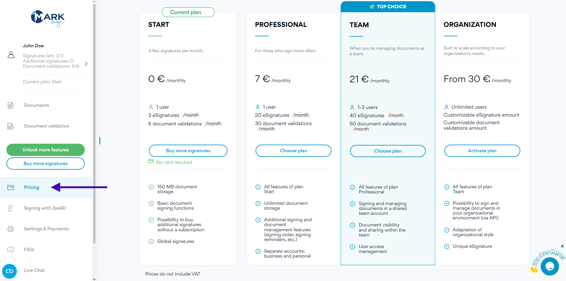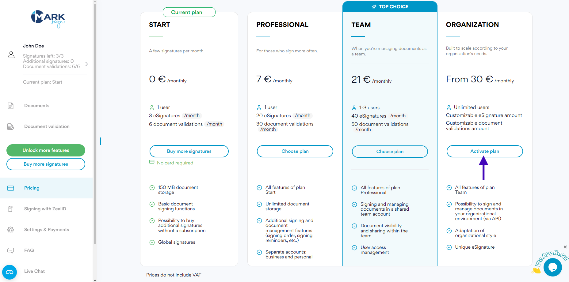 After signing the contract, contact your personal Mark Sign manager who will assign you the Organization plan. All you have to do is log in to your account and activate it.
