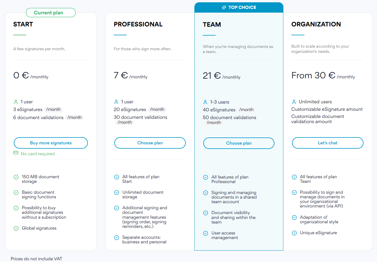 - Start - when you need to sign just a few documents per month. 3 free signatures per month included.