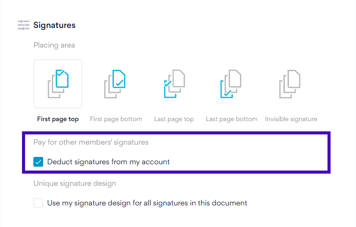 With the Professional, Team or Organization plan, after uploading the document you can choose to have all signatories' signatures covered from your account.